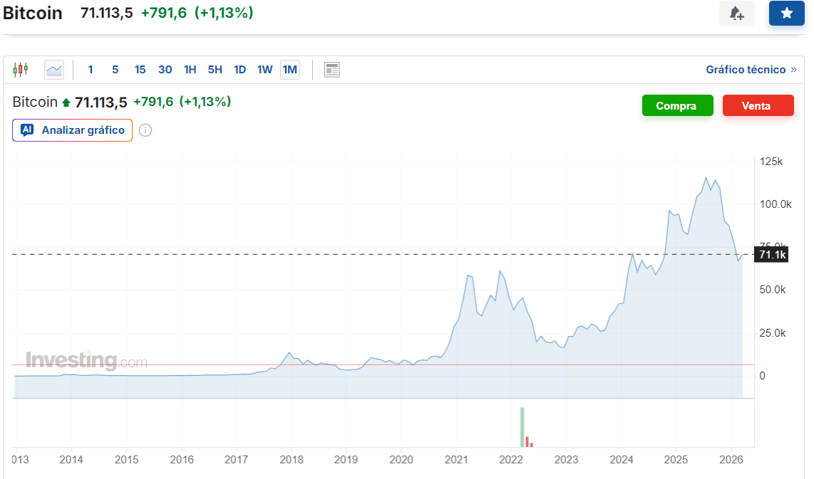 Otro ejemplo claro es Bitcoin. Ahora mismo ha caído bastante desde su máximo. Y es normal que mucha gente vea eso y piense lo de siempre: que si es una estafa, que si es una burbuja, que si esto ya se acabó. Pero eso pasa cuando miras solo el corto plazo. Si miras el histórico completo, ves otra historia: un activo que empezó valiendo centavos y que hoy está presente en fondos de inversión, en instituciones y en el sistema financiero global.